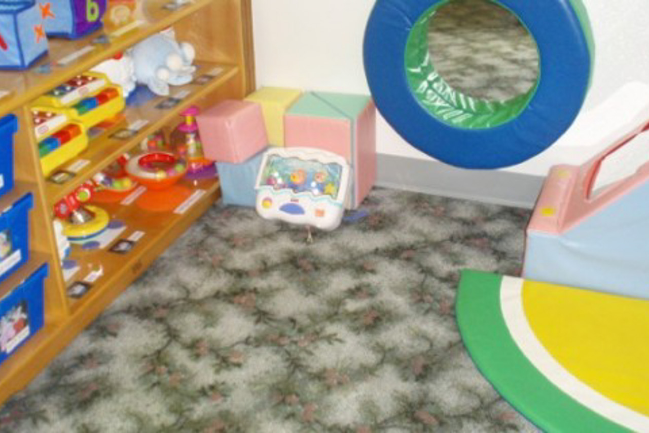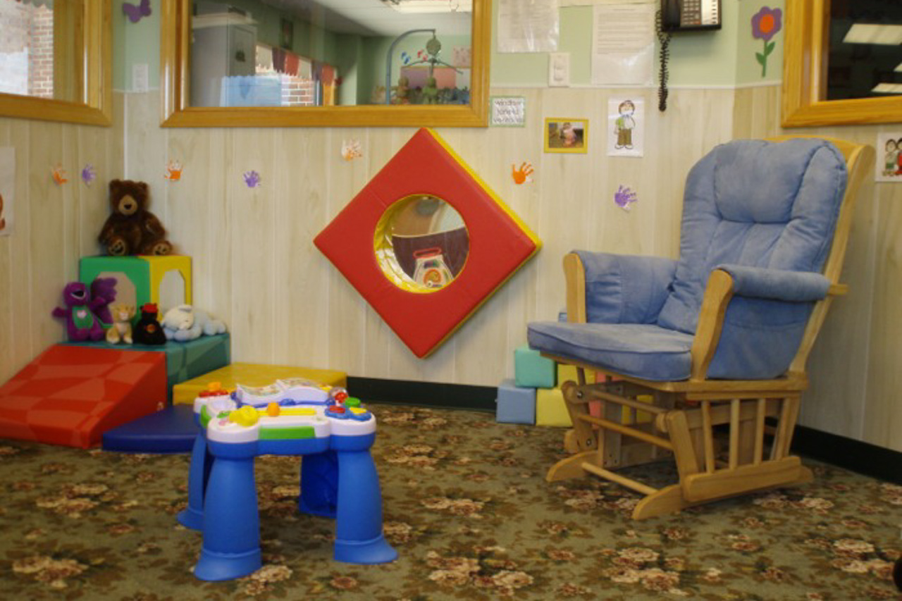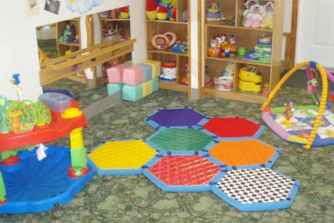 Infant classrooms are designed with wide open spaces to promote crawling, texture mats for tummy time and pull-up bars to build infants’ muscles and strengths.