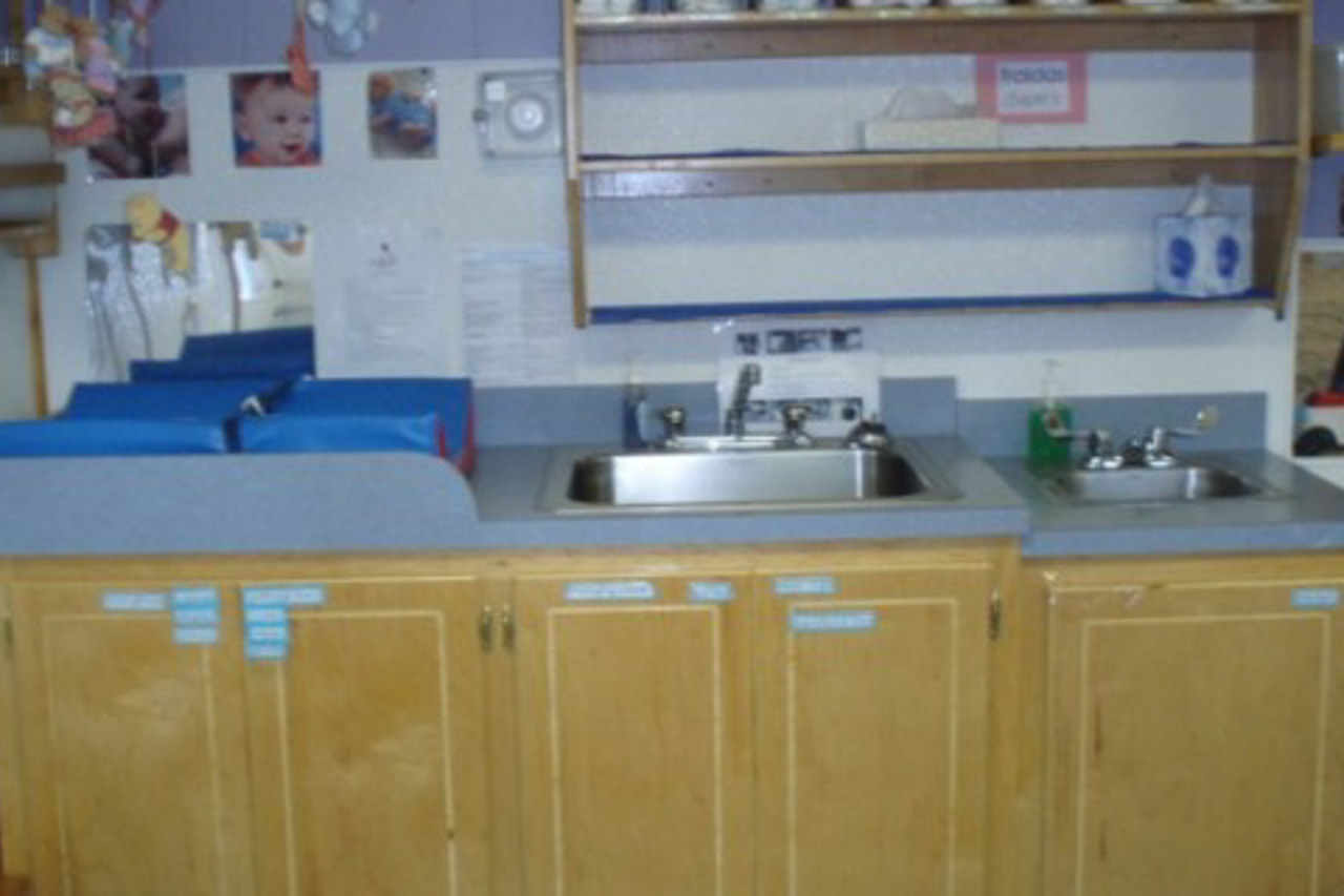 We have our own custom-made changing tables located near running water. Infants can be immediately washing without crossing the classroom and teachers can access all supplies needed in one space.